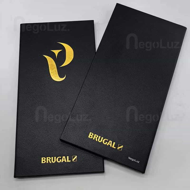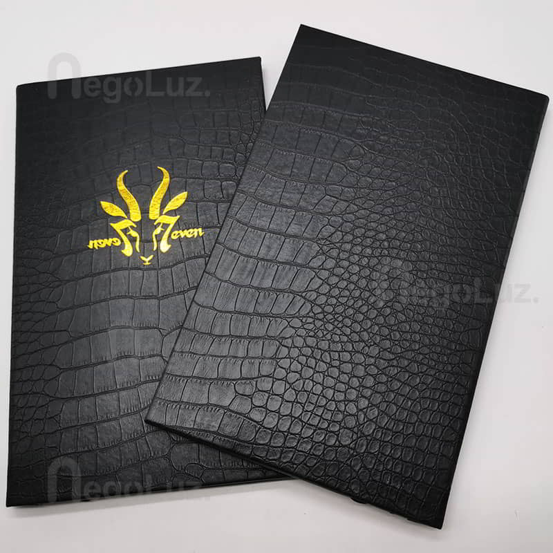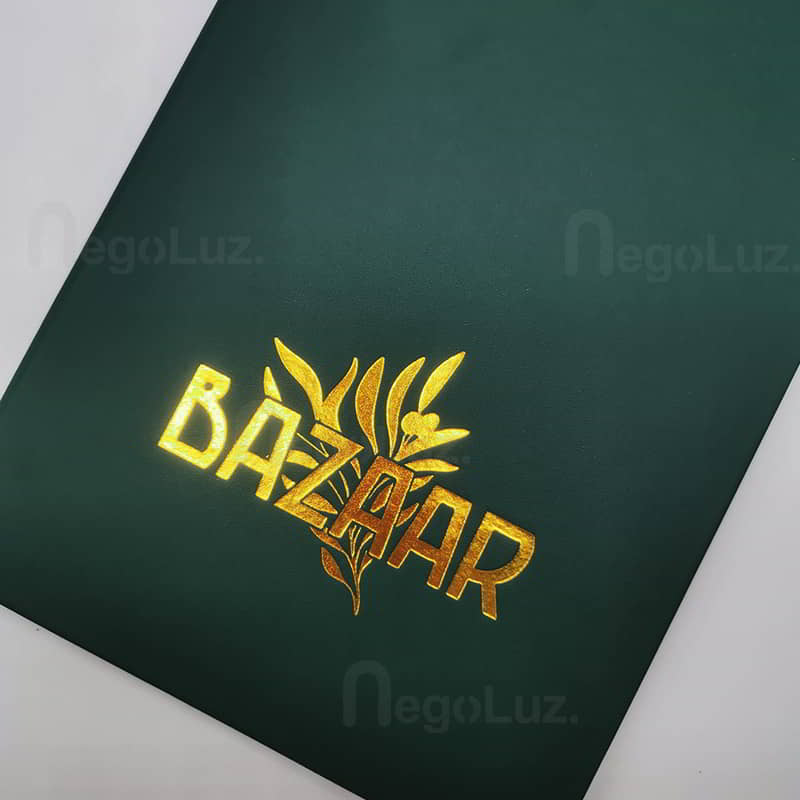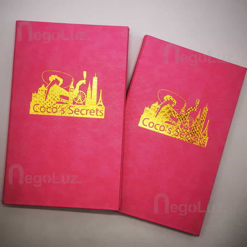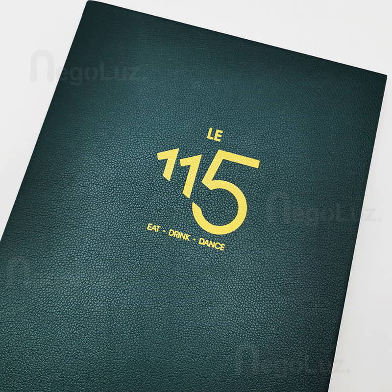 Logo or name is pressed down at high temperature on the menu using gold foil.